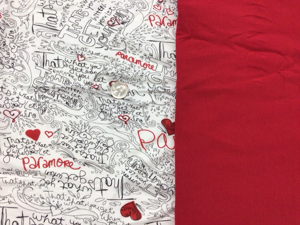 24×38″ yard Black/Red Graffiti on White + 18″x60″ solid red. Graffiti is Rayon/Poly. Solid black is cotton/lycra .