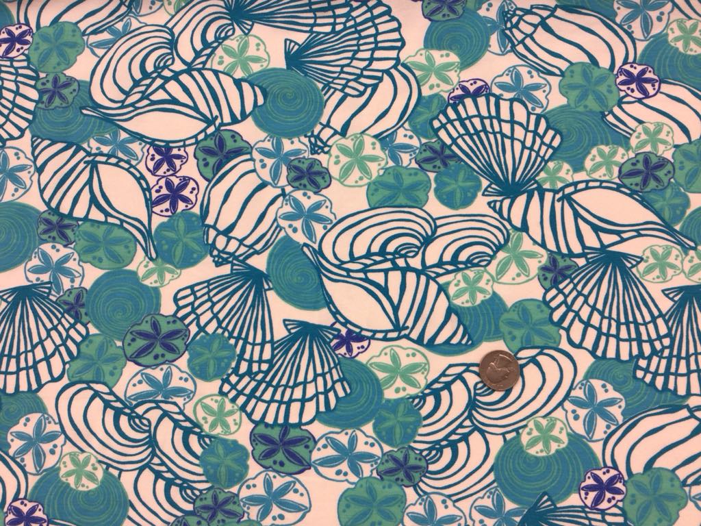 “Jade & Royal Blue Seashell Collection on White” Med-weight, 4way stretch, cotton lycra, 60″ wide.