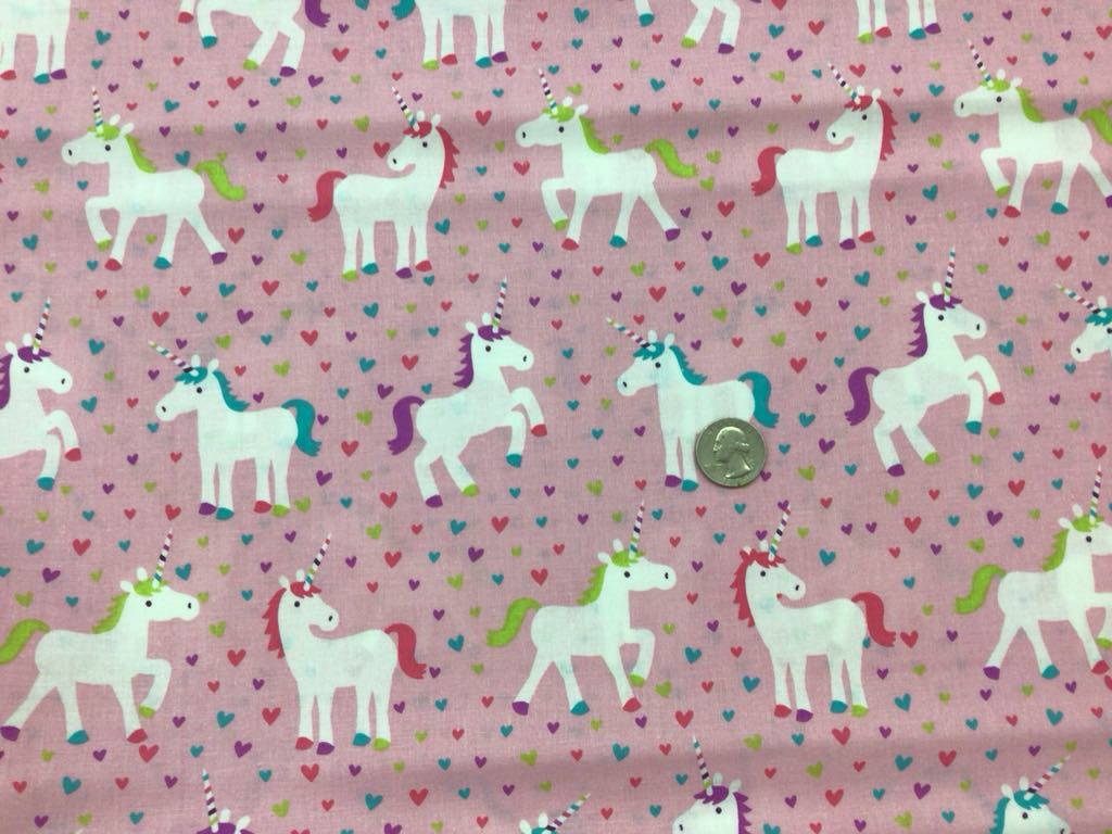 Joann’s “Heart Unicorns on Pink” 100% cotton woven, 42″ wide.