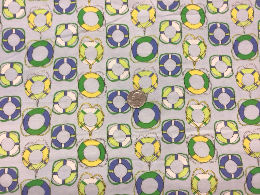 “Life Preservers on Light Blue” med-weight, 4way stretch, cotton/lycra.