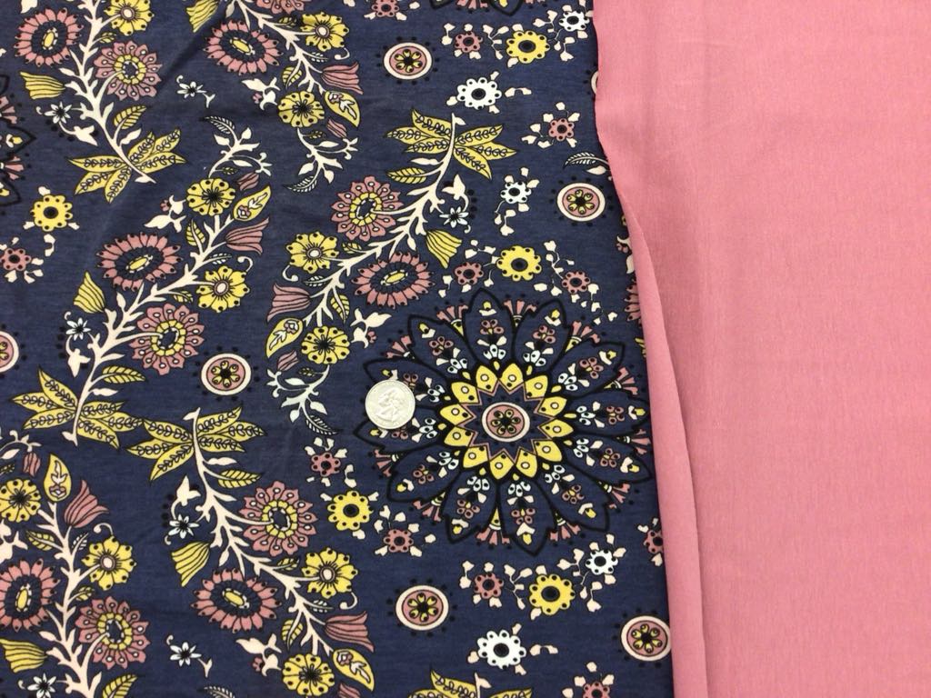 18″x60″ Medallions on Navy+ 20″x60″ solid Mauve (you can get another CL solid if you wish.) The medallion fabric is a medium-weight, 2way stretch 100% cotton jersey. The solid mauve is a med-weight, 4way stretch, cotton lycra.