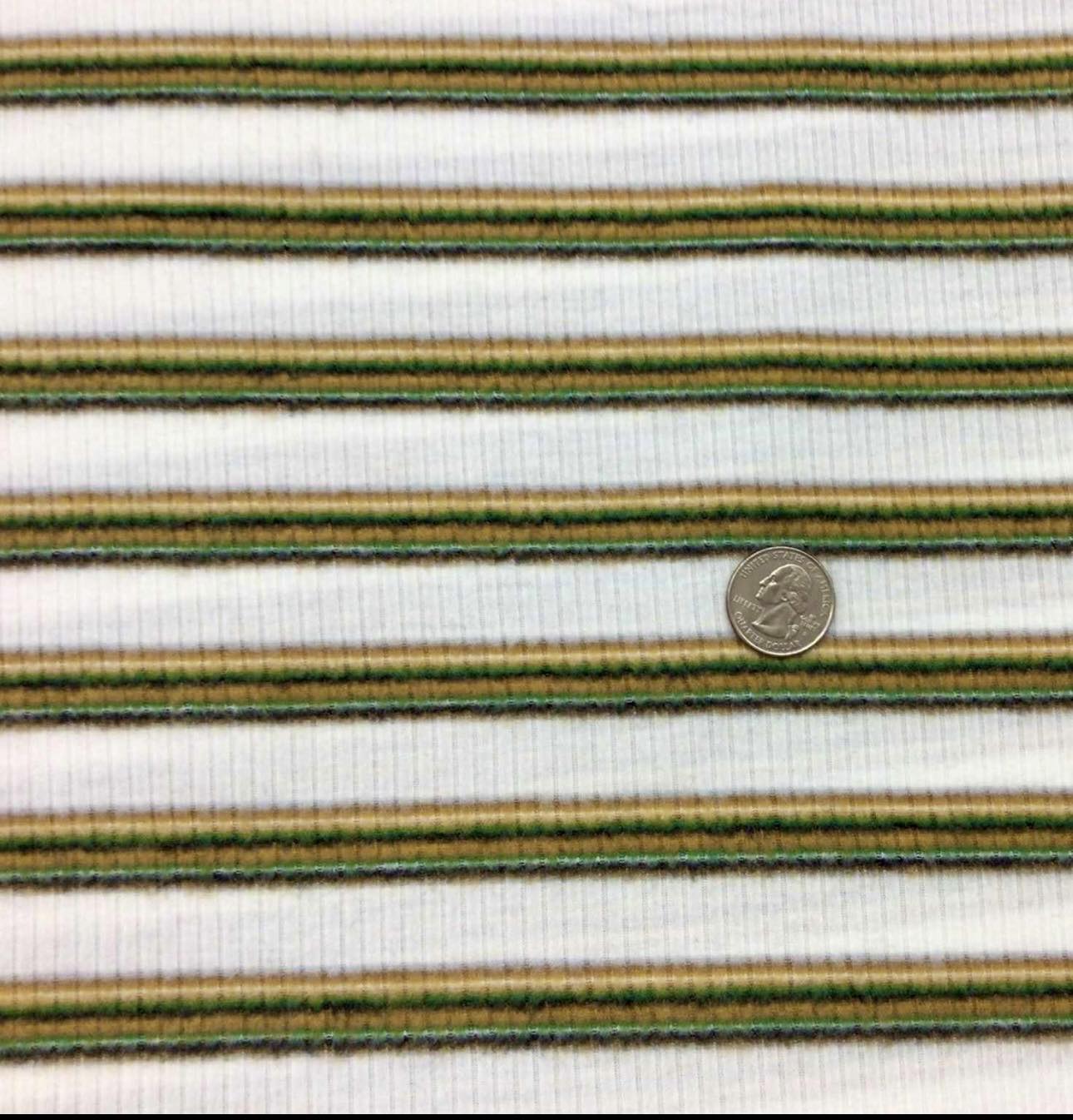 Mustard/light sage/black/white stripes, 4way stretch, med weight, brushed rib knit, poly/rayon/spandex blend, 60” wide.
