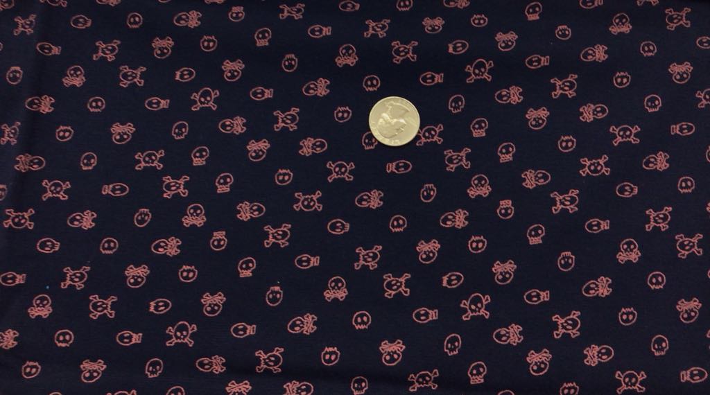 “Pink Crossbones on Navy” medium-weight, 2way stretch, 100% Cotton Baby Rib, 60″ wide.