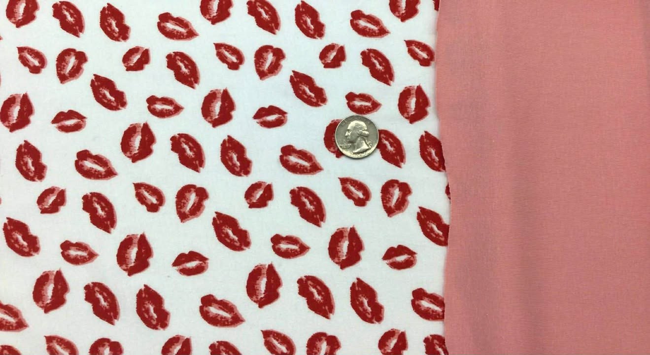 1 yard x 60″ Red Lips on White + 22″x60″ solid Mauve (you can get another CL solid if you wish.) These are both medium-weight, 4way stretch, cotton lycra.