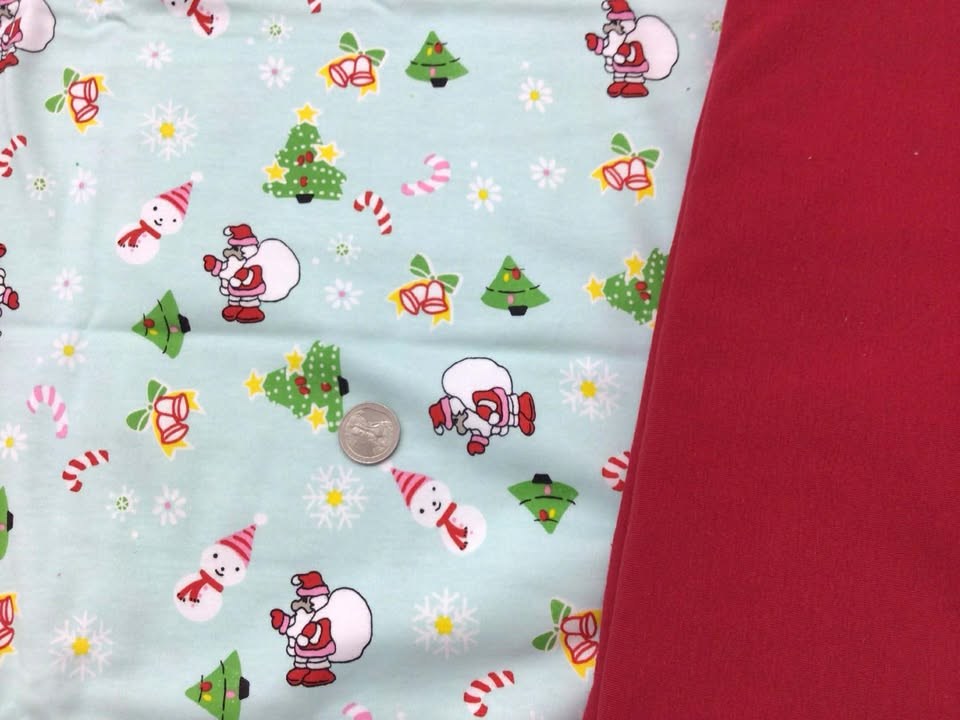 18″x60″ Santa/Snowman on Mint + 20″x60″ solid red (you can get another CL solid if you wish.) The Santa fabric is a medium weight, 2way stretch, 100% cotton interlock. The solid red is medium-weight, 4way stretch, cotton lycra.