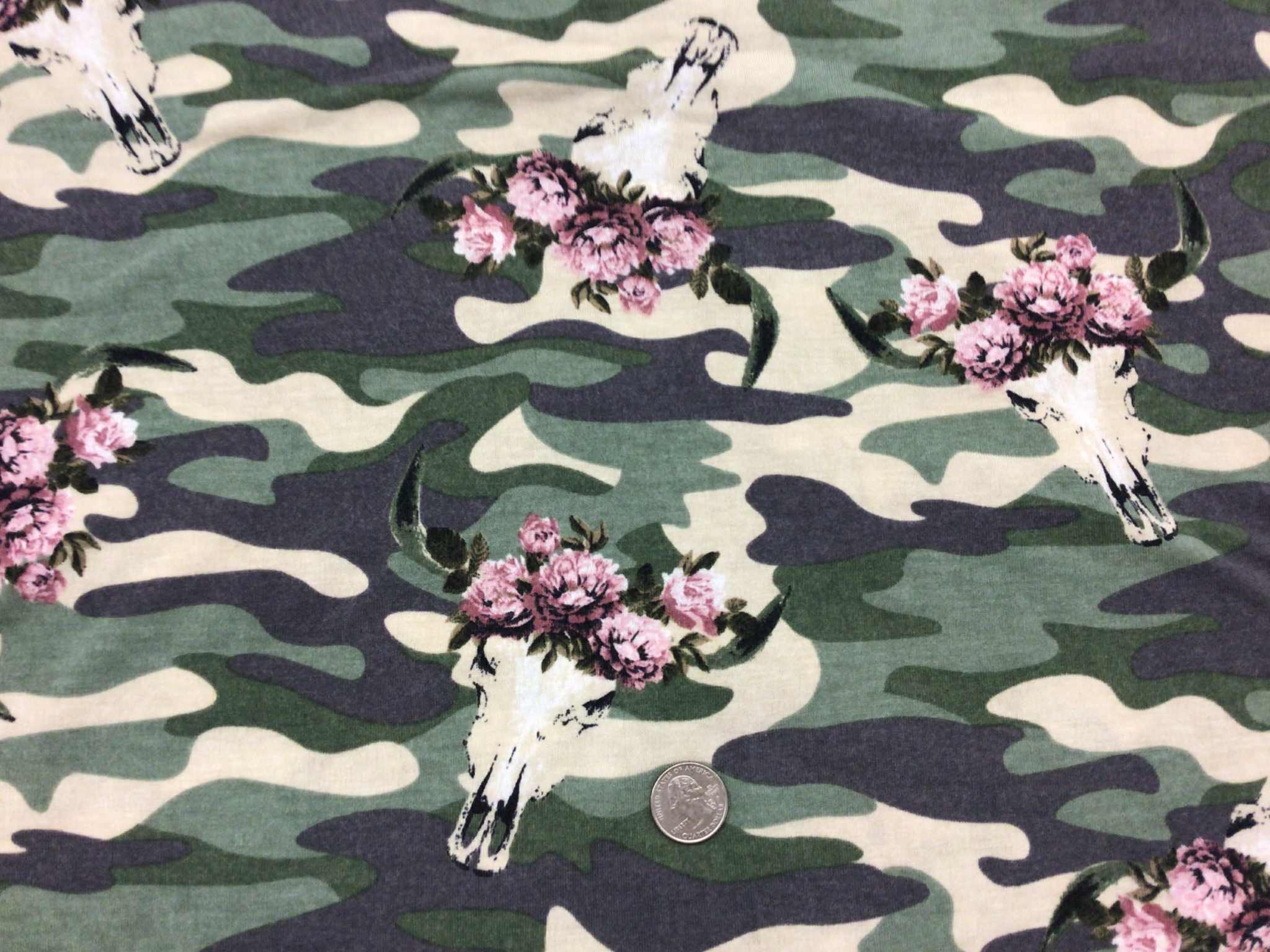 “Steer Skulls on Camo” light-weight, 4way stretch, rayon spandex, 60″ wide.