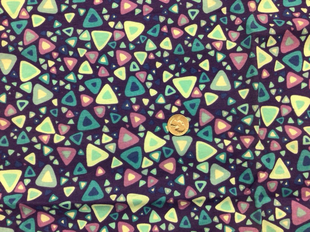 “Triangles on Purple” medium-weight, 2way stretch, 100% Cotton jersey, 60″ wide. I have 1 yard + 8″ available.