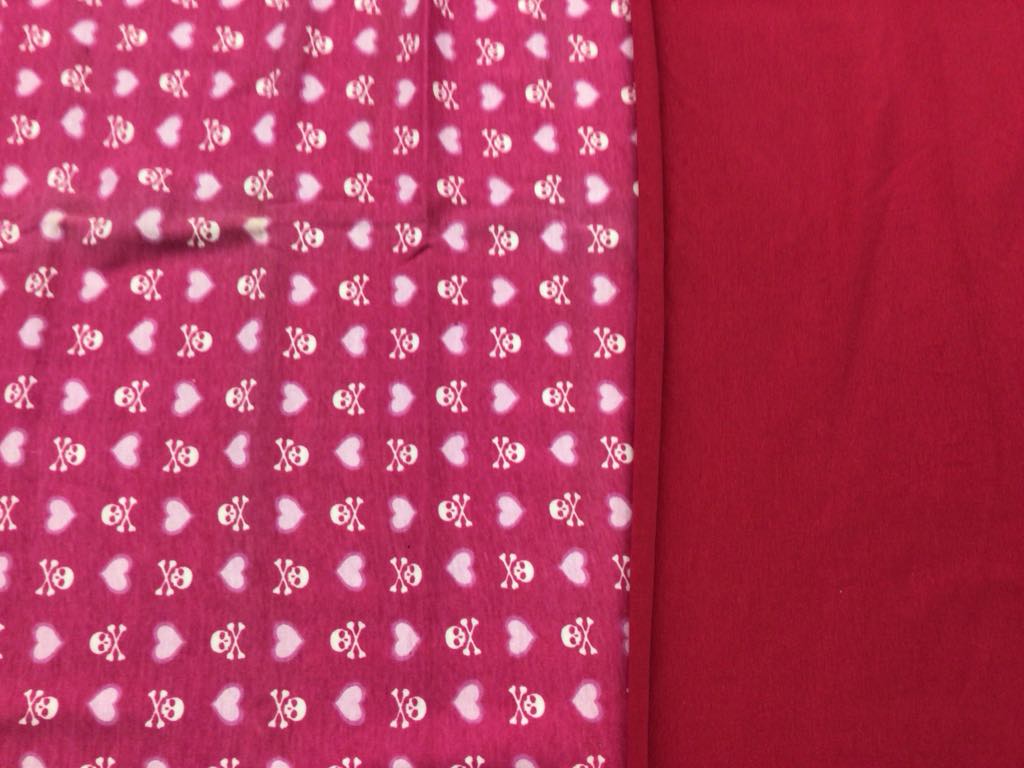 20″x60″ White Crossbones on Hot Pink + 18″x60″ solid Hot Pink. The crossbone fabric is a medium-weight, 2way stretch 100% cotton jersey. The solid hot pink is a med-weight, 4way stretch, cotton lycra.