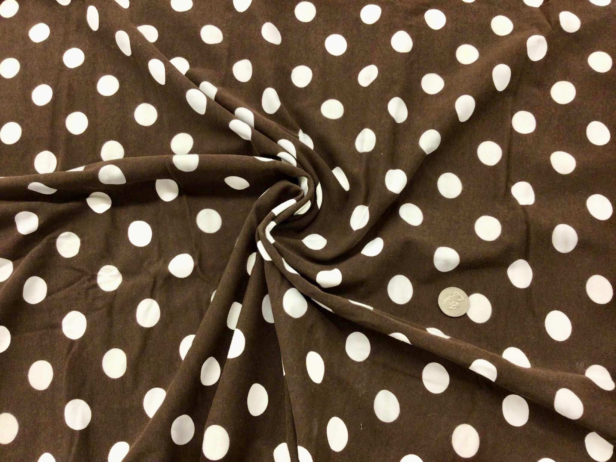 “White Dots on Brown” Med-weight, 4way stretch, cotton lycra, 60″ wide.